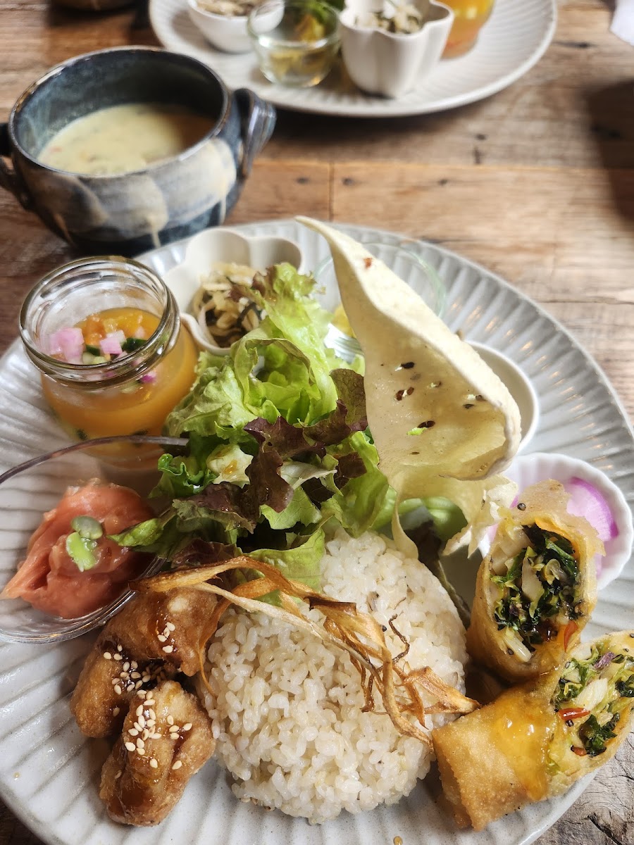 The café specializes in vegan cuisine, showcasing a variety of delightful options that even non-vegans will find irresistible. According to satisfied guest Shak Yiz, "the lunch was great, every small dish was tasty," with a generous portion ensuring no one leaves hungry. The standout offerings include a vibrant vegan lunch plate, featuring dishes like dried soybean meat karaage with sweet and spicy sauce, refreshing morning glory and cold soup, and a hearty ratatouille bursting with summer vegetables. Each component is thoughtfully prepared and beautifully presented, ensuring a feast for both the eyes and palate.